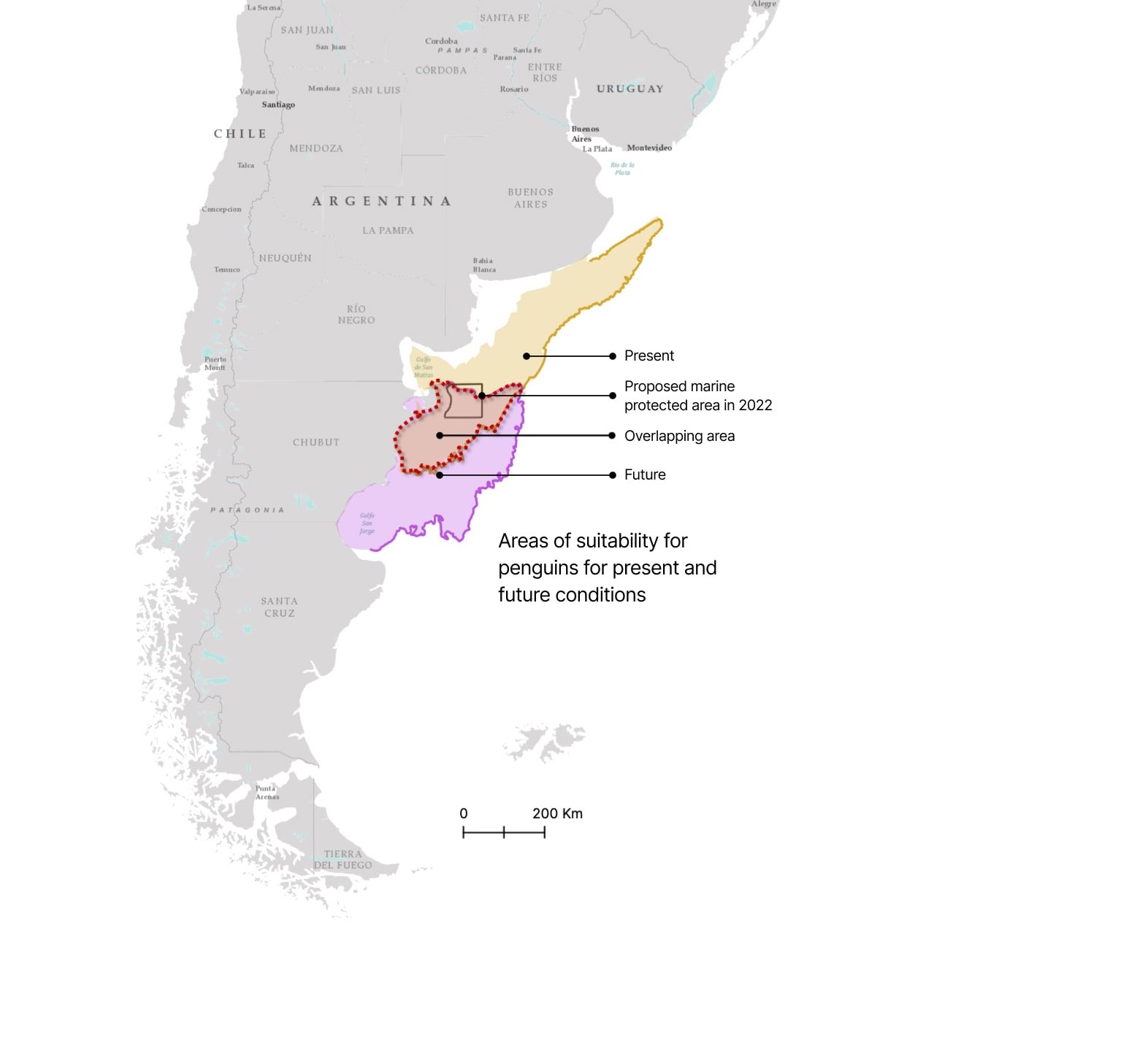 The projections for oceanic variables were combined with the previously established optimal conditions for Magellanic penguins to map the most suitable areas for penguins in the future.