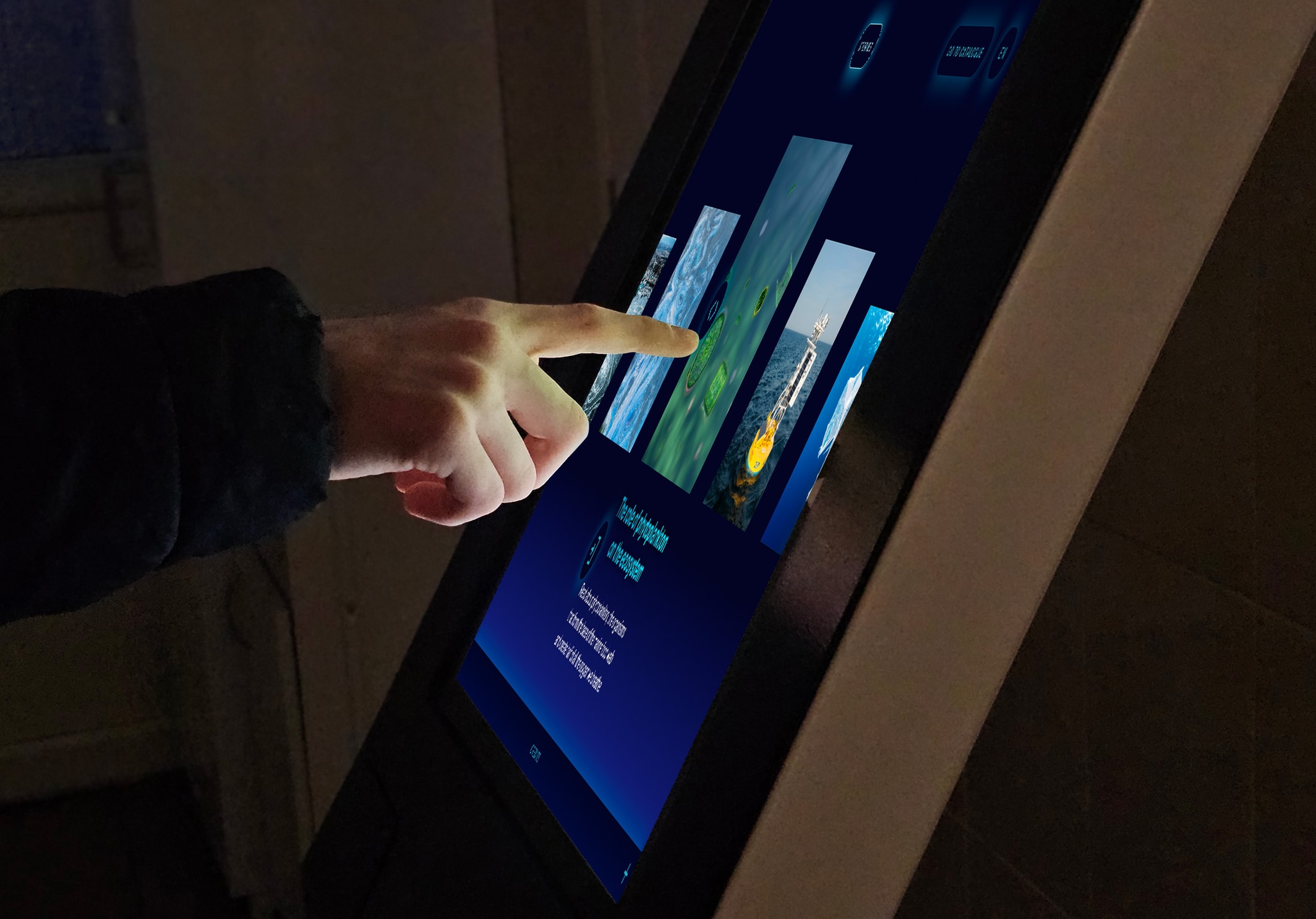 The interface has a strong visual approach displayed in an interactive touch screen as part of the immersive installation experience.